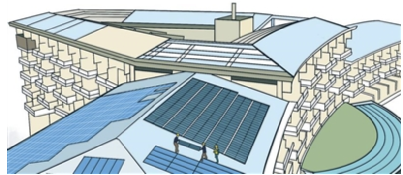 為了確保建筑美觀,裝在屋頂的光伏板在設計上也綜合考慮了建筑本身的外觀與結構,契合屋頂坡度。此外,為充分利用建筑空間,項目團隊在不影響建筑透光的情況下,還設計了玻璃幕墻發電、遮陽板發電、欄桿發電、連廊頂棚玻璃發電等。